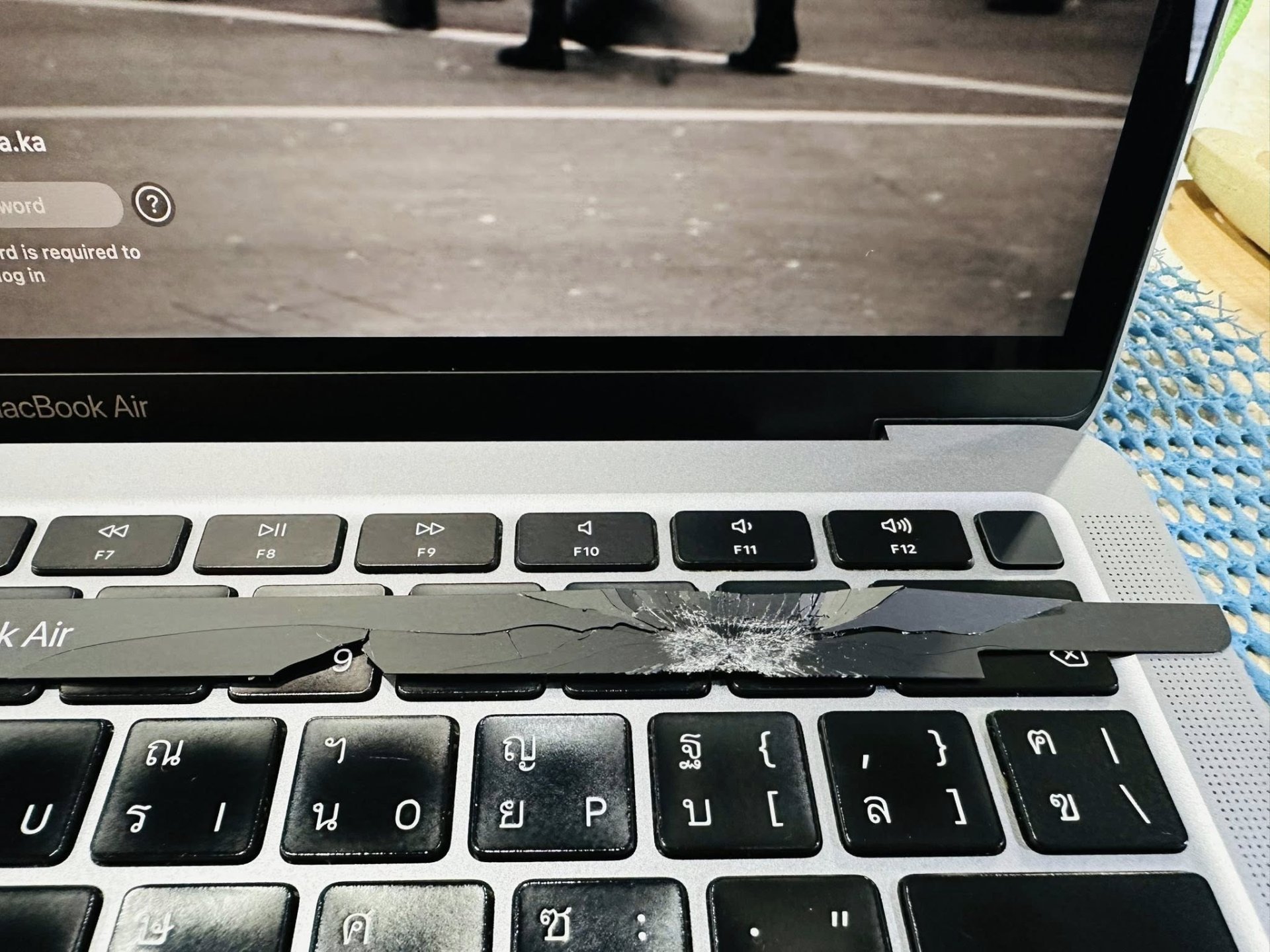 ตรงป้ายโลโก้แถบสีดำที่อยู่บริเวณขอบล่างของหน้าจอ MacBook นั้นวัสดุจะคล้ายกระจกบางๆ จึงทำให้แตกหักง่าย ซึ่งชิ้นส่วนนี้สามารถเปลี่ยนใหม่ได้ แต่ต้องทำโดยช่างผู้ชำนาญการเท่านั้น เพราะชิ้นส่วนนี้ไม่ใช่แค่ทำไว้เพื่อความสวยงามเท่านั้น แต่ยังทำหน้าที่เป็นตัวป้องกันสายแพรจอที่อยู่ด้านในไม่ให้เสียหายอีกด้วย